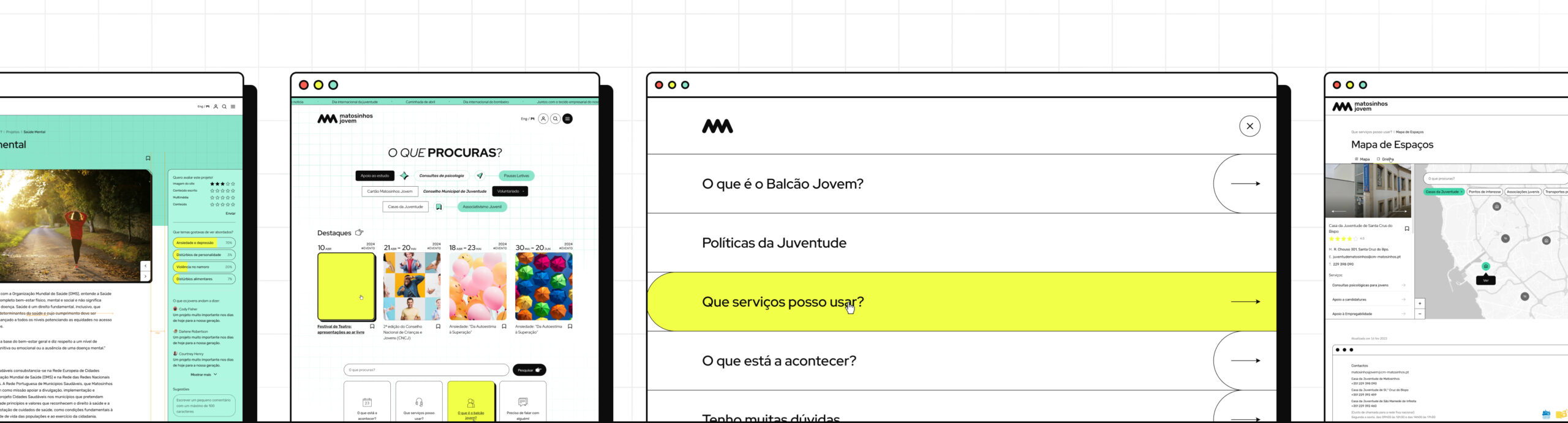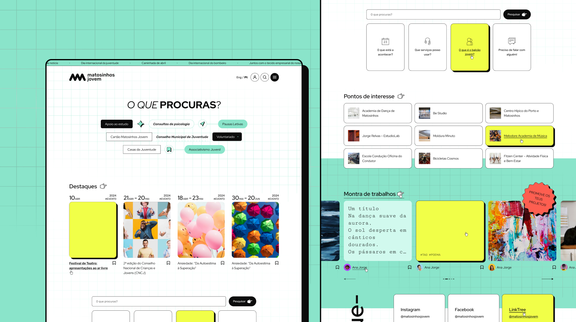 The Balcão Matosinhos Jovem platform was designed to go beyond a standard municipal website — it serves as a functional tool to foster active youth engagement. Features like event registration, real-time chat, smart search, and interactive maps make the experience intuitive and dynamic.